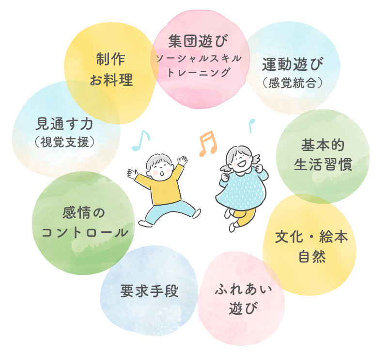 放課後等デイサービスは、発達の遅れや心配のあるお子さんを対象に日常生活における基本的な動作の指導、集団生活への適応を訓練していきます。
